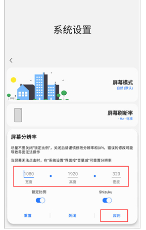 3、输入计划修改的宽度、高度与密度数值;建议保持“锁定比例”开启,若关闭则需谨慎操作,错误设置可能导致触控失灵。若屏幕无法点击,可在系统设置界面长按音量减键以恢复默认分辨率。