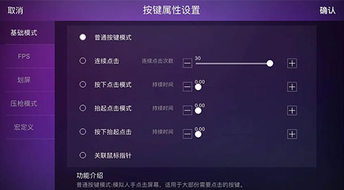 (5)将按键属性设为“压枪模式”,选择开火键并调节压枪幅度,连点频率可按需调整;