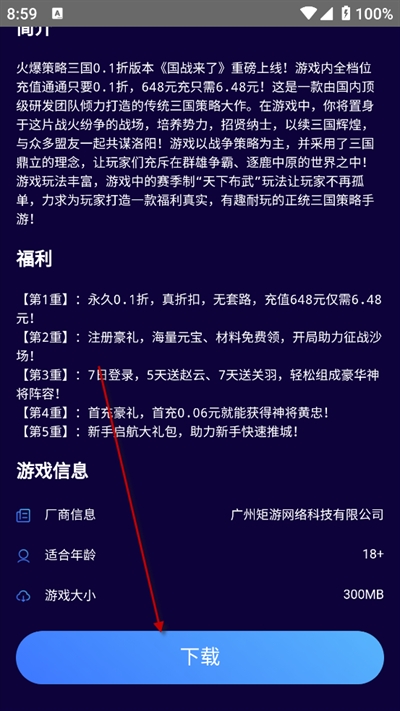 3、在游戏详情页下拉至底部,找到并点击下载按钮即可获取游戏。