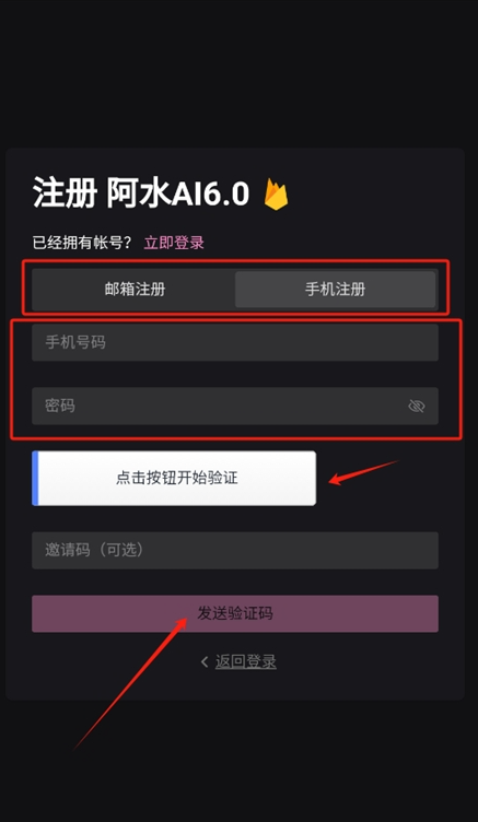 此处以手机注册为例,输入手机号码并设置密码,完成安全验证后点击发送验证码,即可快速完成注册流程;