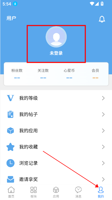 首先下载并安装奇心社区应用;打开进入首页后,点击右下角“我的”页面,选择“未登录”入口。
