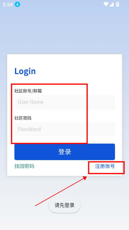 如果已有账号可直接登录;新用户则点击“注册账号”开始注册流程。