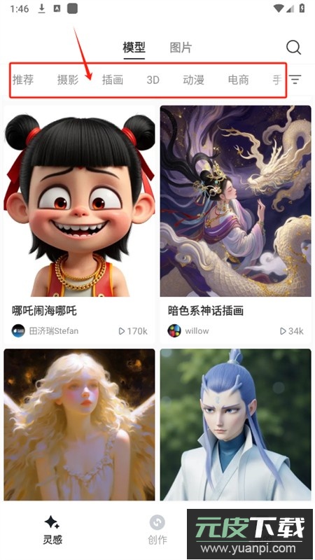 2、进入主界面,可以看到按领域分类的风格模型,例如摄影、插画、3D、动漫等。
