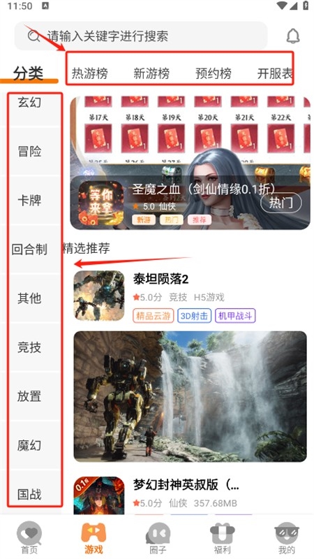 3、点击游戏栏目,查看详细分类与排行榜单;