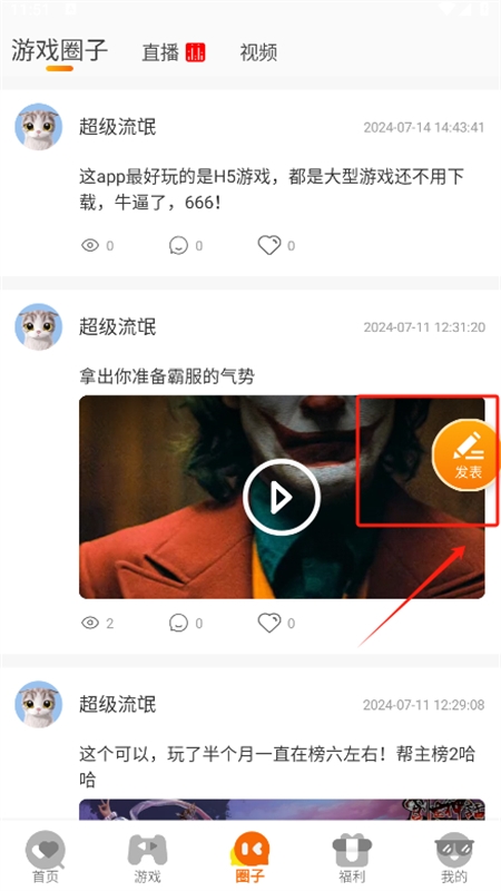 4、进入圈子页面,查看其他玩家的发帖动态,也可自行发布内容;