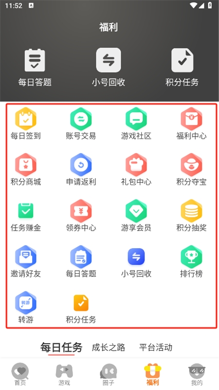 5、打开福利中心,使用每日签到、账号交易、游戏社区及福利中心等功能;