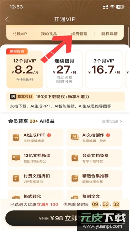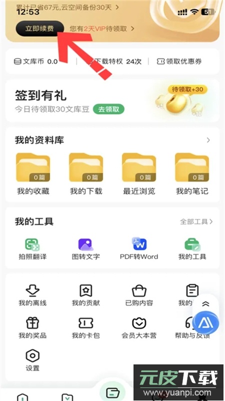2、在个人中心界面里,找到并点击“立即续费”相关入口。
