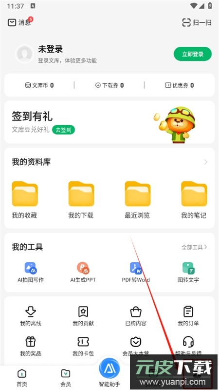 1、首先在手机上打开百度文库应用,进入后点击底部“我的”页面。