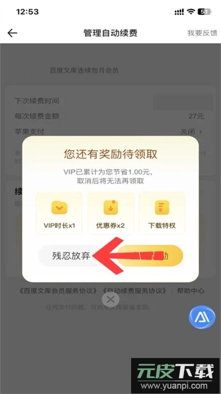 5、最后在确认提示中选择“残忍放弃”,即可成功取消自动续费服务。
