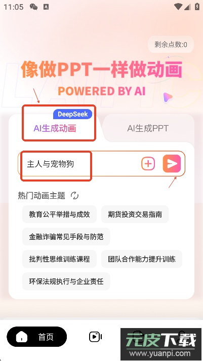 成功登录后,在首页找到“AI生成动画”入口;输入你想制作的动画主题,点击右侧箭头进入下一步。