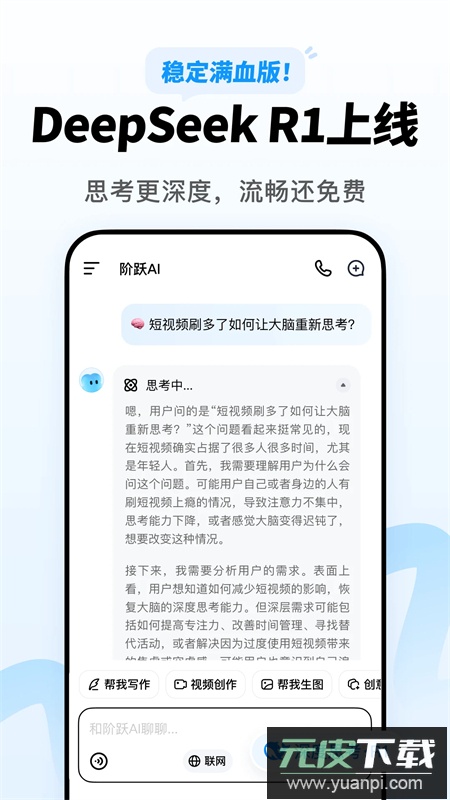 阶跃AI应用最新2025版本由上海阶跃星辰智能科技有限公司研发,是一款集成多种智能服务的工具。它全面接入Deepseek-R1满血版,功能更为强大,能够提供智能问答、语言翻译、创意写作与编程辅助等支持,轻松应对各类使用场景,满足用户多样需求。