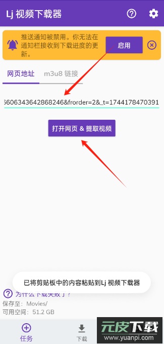 4、将复制的链接粘贴到下载器的输入框中,点击“打开网页提取视频”按钮。