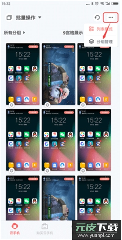 1、在专业版安卓端的云手机列表界面,点击右上角省略图标,选择分组管理功能,即可依据项目任务对所有云手机进行分组归类。