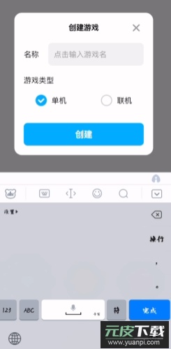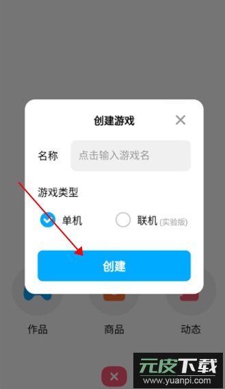 1.创建项目:打开创游世界,进入创游编辑器,点击下拉菜单中的“+”号,选择“作品”选项;输入游戏名称并选定类型,点击“创建”即可。