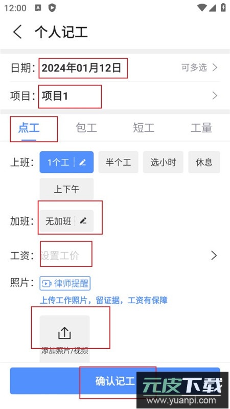 5、在跳转的页面内依次设置日期、项目时间、上班时间、是否加班、设置工价、添加相关照片或视频,全部信息确认无误后点击“确认记工”即可完成操作。