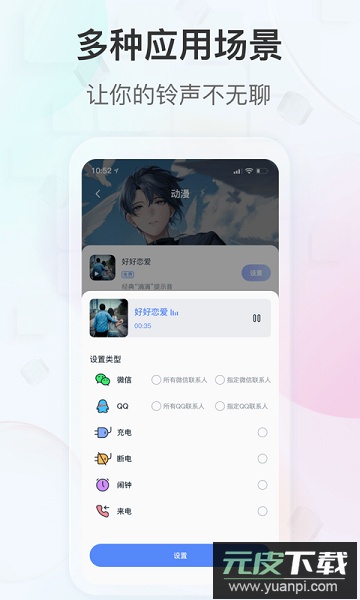 应用场景多样,可根据喜好添加不同使用场景;用户可浏览多种铃声类型,遇到合适的内容便能一键设置;资源库容量庞大,随时都能发现并获取喜欢的音效素材。