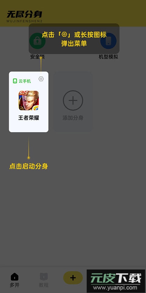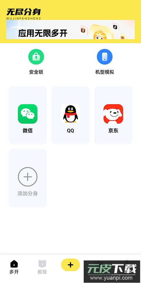 1、打开已下载的无尽分身应用,点击下方加号添加软件;