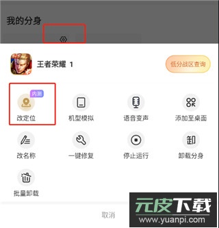 4、长按王者荣耀图标左上角的齿轮按钮,弹出菜单后点击修改定位;