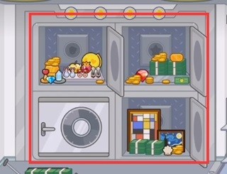 走到银行二楼区域,找到墙上的保险柜,先按照提示找到对应形状的钻石、红心、星星和贝壳,再按顺序放入对应凹槽,保险柜就会自动弹开,里面藏着不少稀有宝物。