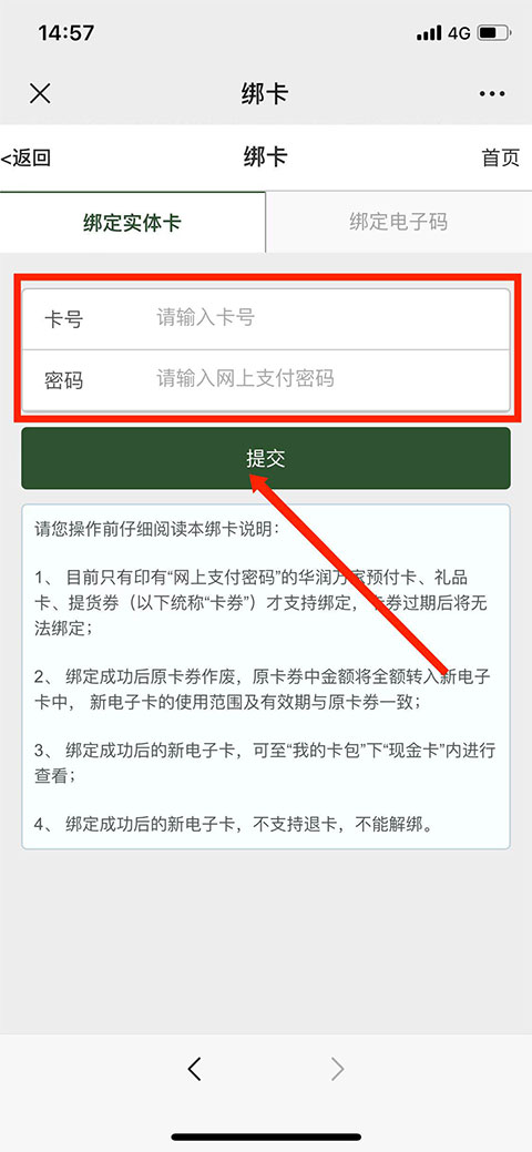 4、进入绑卡页面,准确填写“卡号”与“密码”后,点击“提交”即可完成绑定。