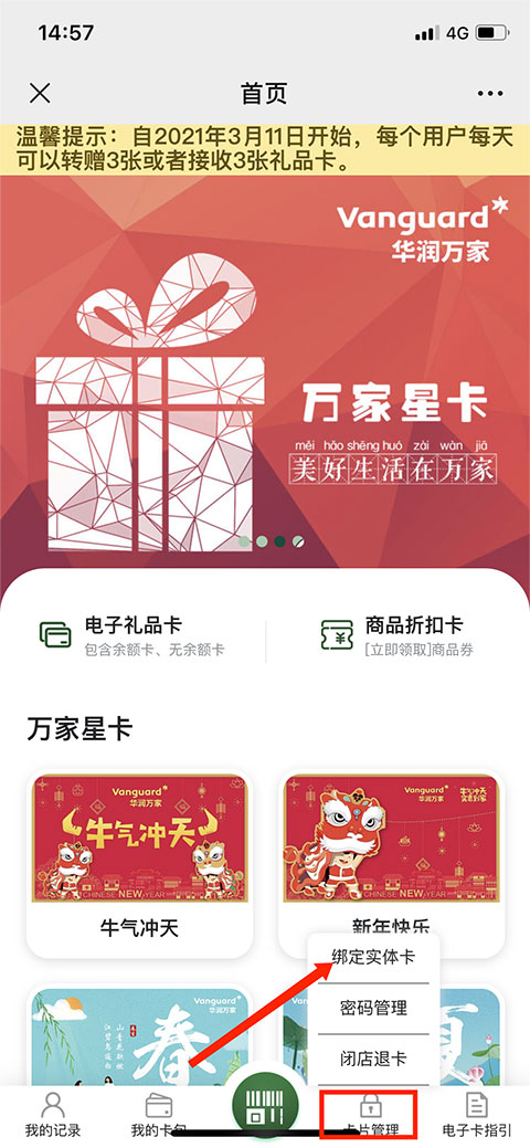3、点击右下角“卡片管理”,然后选择“绑定实体卡”选项,开始绑定操作。