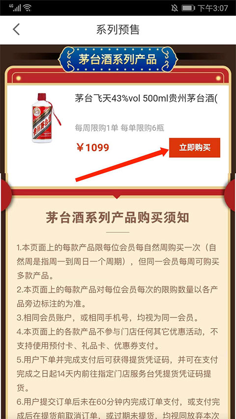 4、确认茅台商品信息无误后,点击“立即购买”;待抢购时间开始,即可第一时间提交订单。