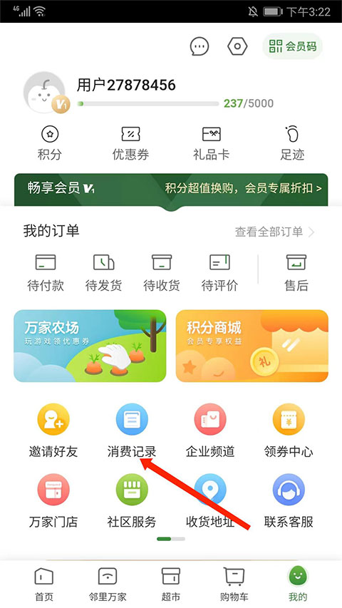 2、在个人中心界面,找到并点击“消费记录”图标,查看可开发票的订单。