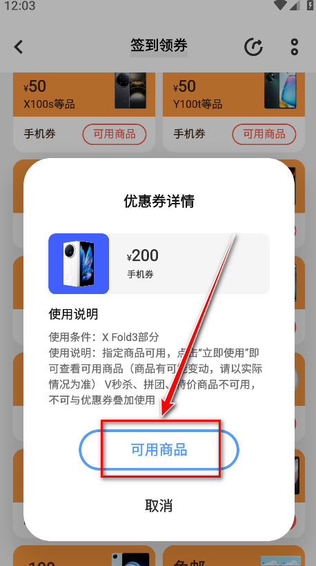 3.领取后点击可用商品查看适用范围。