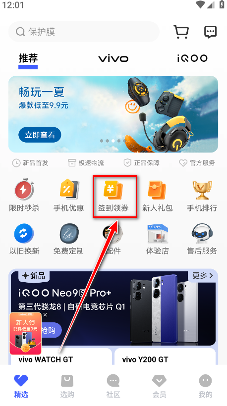 1.启动vivo商城应用,找到并点击签到领券入口。