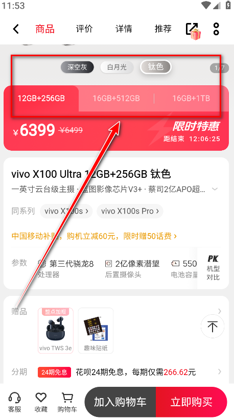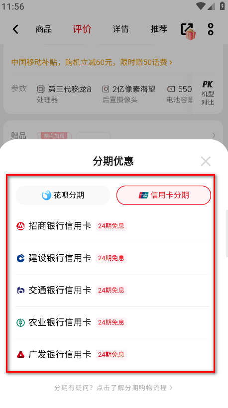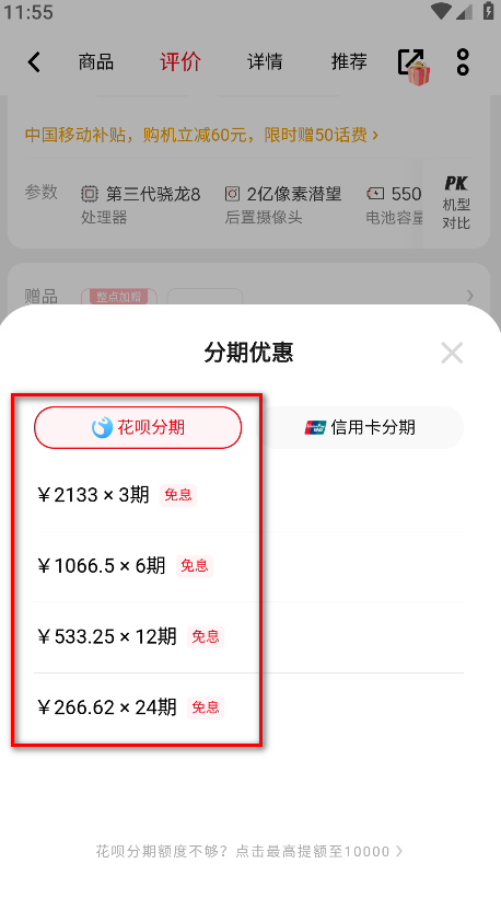 3.在购买页面点击分期选项。