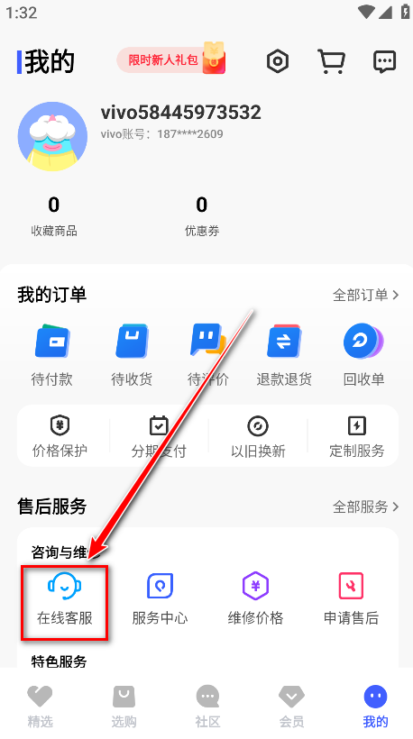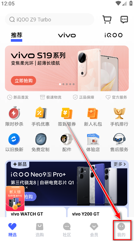 1.打开vivo商城,点击右下角我的。