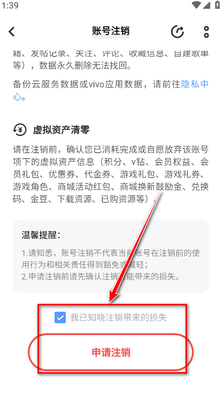 7.勾选已知晓注销带来的损失,点击申请注销。