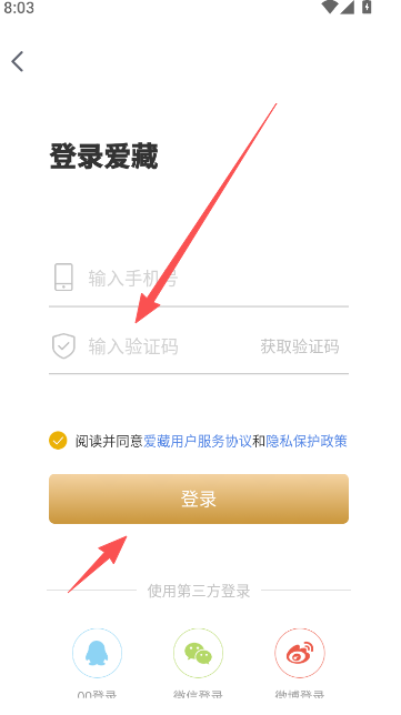 1、点击进入登录页面,输入手机号码短信验证码信息。