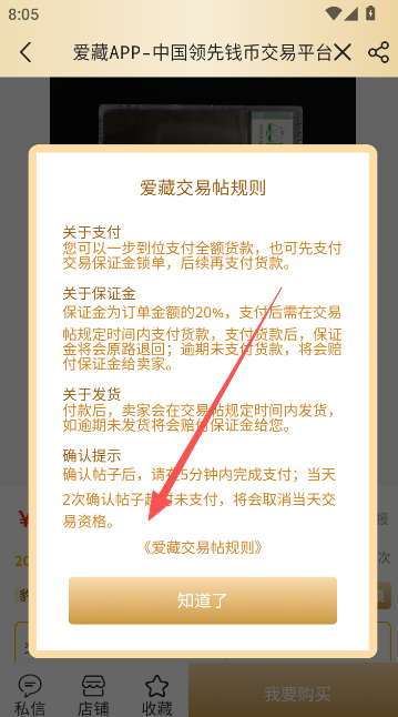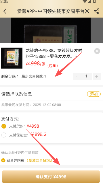 5、点击确认支付完成最后的下单操作,记住勾选下方的爱藏交易帖规则选项,以上就是完整交易过程,各位藏家们赶快交易起来吧。