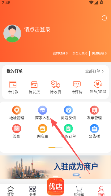 1、进入铸源优品app个人中心页面,点击商家入驻选项;