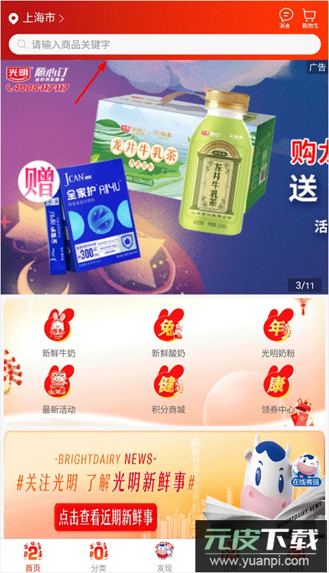 2、随后可以在搜索框中查找您需要的光明产品,牛奶、茶饮或其他在售商品均可购买。
