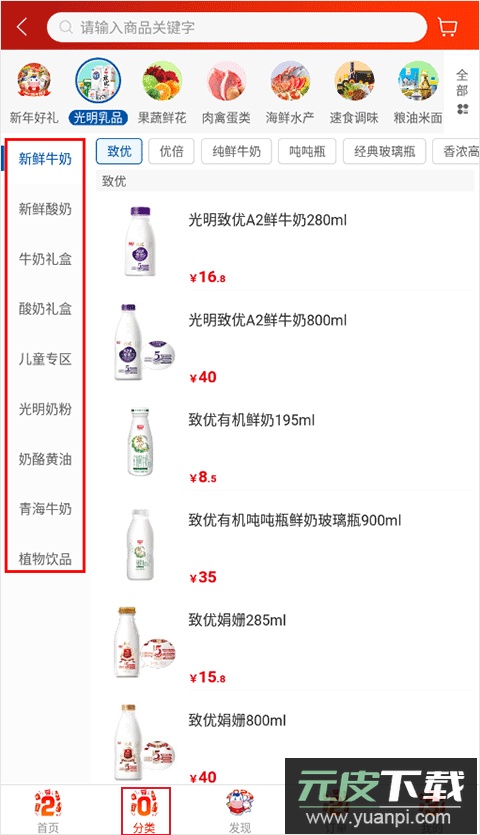 3、也可以在分类功能模块中查找,分为新鲜牛奶、酸奶等类别,根据实际需要选择下单。