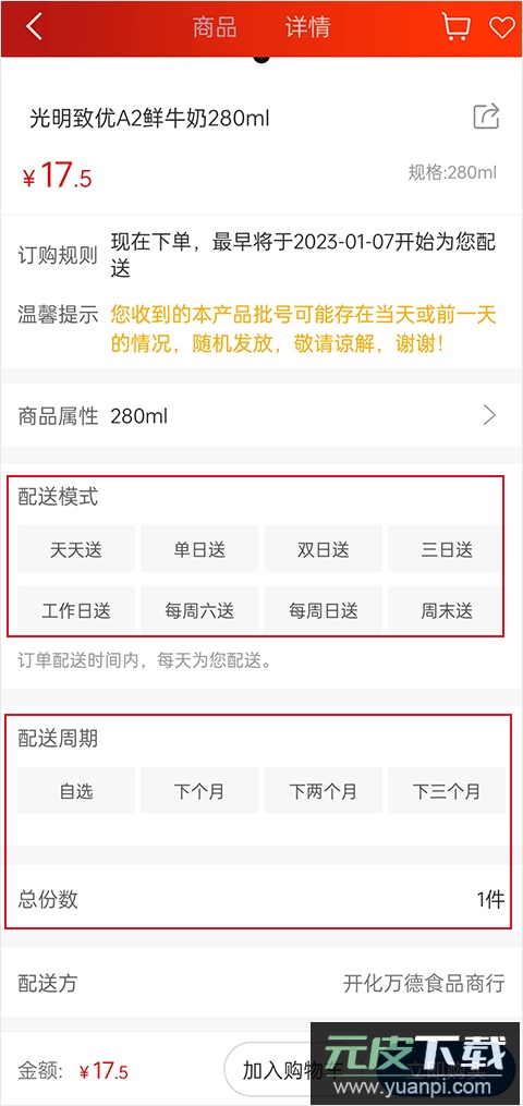 4、选择需要的牛奶后,确定配送模式、配送周期以及所需份数,确认后即可下单购买。