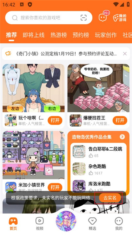 2.进入主界面之后,底部会显示“去实名”的选项,点击进入对应页面;