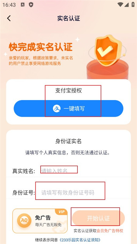 3.跳转到实名认证页面之后,你可以选择用支付宝授权一键填写信息,也可以手动在下方输入框里填写自己的真实姓名和身份证号,点击“开始认证”提交实名认证申请;