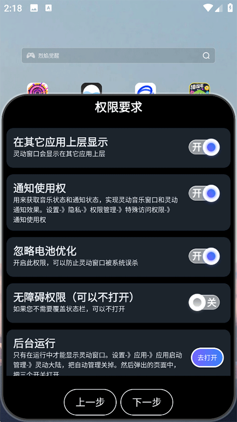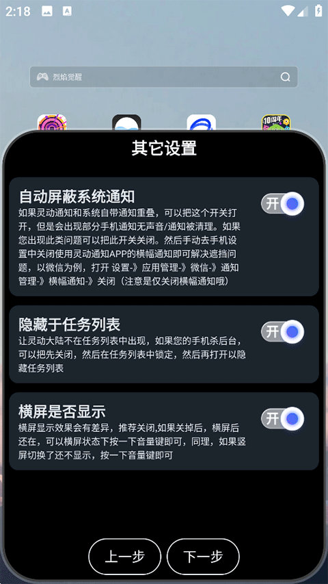 4、完成权限设置后进入其他配置环节,可以设置自动屏蔽系统通知、隐藏于任务列表、横屏状态是否展示等选项,设置完毕点击下一步;
