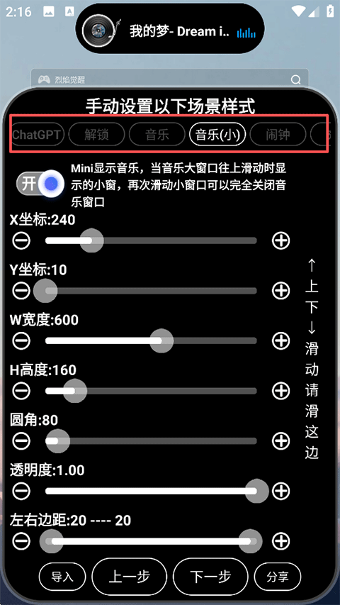2、在页面上方预览各插件对应的灵动岛展示效果,下方可以调整灵动岛的坐标位置、宽度高度、形状透明度以及边距等参数,调整完成后点击下一步;