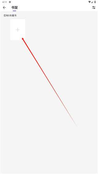 第二步,进入书架功能页后,可以看到当前还没有收藏任何书籍,点击页面上的加号按钮即可查找想要的书籍。