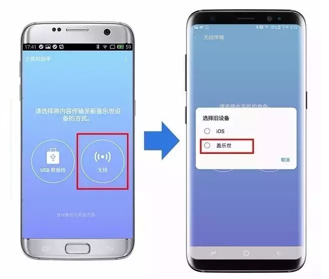 1、先下载并安装对应app,打开后根据自身设备情况选择对应操作系统和传输模式,优先推荐无线传输模式,本次就以无线传输为例做操作演示;Galaxy S7、S8机型出厂默认预装该应用,点击【设置】-【云和账户】-【助手】就能直接打开。