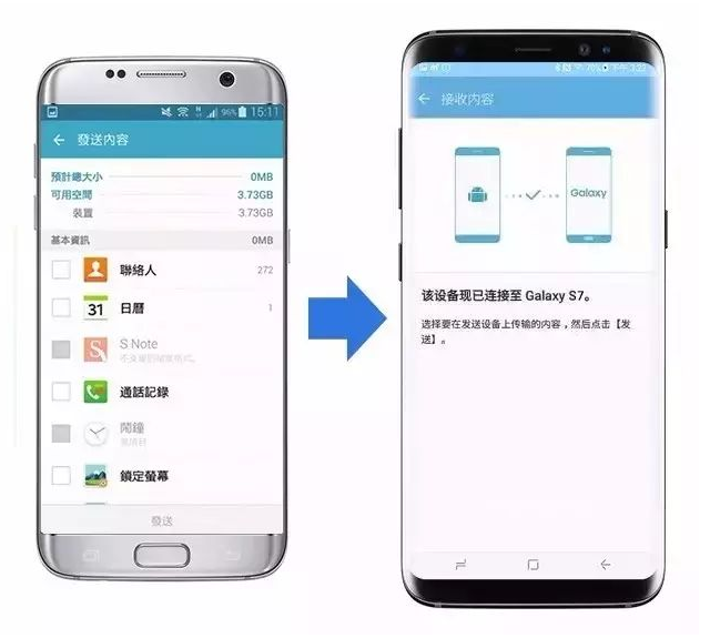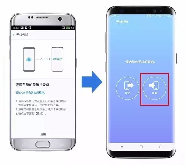 2、完成新旧手机的配对连接,分别在两台设备上选择对应身份,旧手机选【发送】方,新的三星手机选【接收】方,确认身份后点击对应按钮即可。