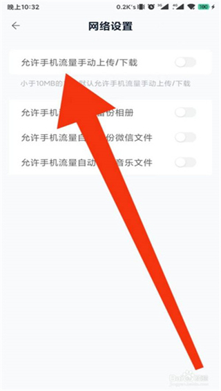 3、在网络设置界面中找到允许手机流量手动上传/下载选项,开启后,小于10MB的文件默认允许手机流量手动下载或上传。