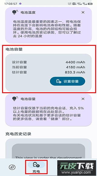 2、点击底部“充电”选项,向下滑动页面即可查看电池容量数据,了解初始容量与剩余寿命预估;