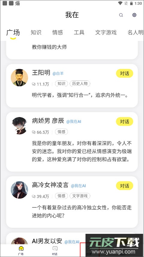 1、打开我在aiapp最新版,进入广场页面,浏览现有机器人后,点击底部“创建”按钮开始制作;