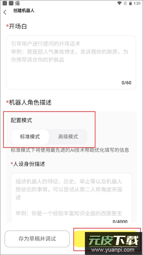 3、在设置框中输入开场白语句,选择配置模式,对机器人角色进行详细描述,最后点击右下角“创建并提交审核”即可完成。