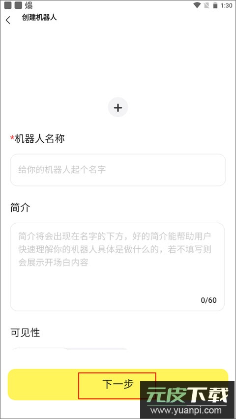 2、填写计划创建的机器人名称与简要介绍,设置可见范围并进入下一步;